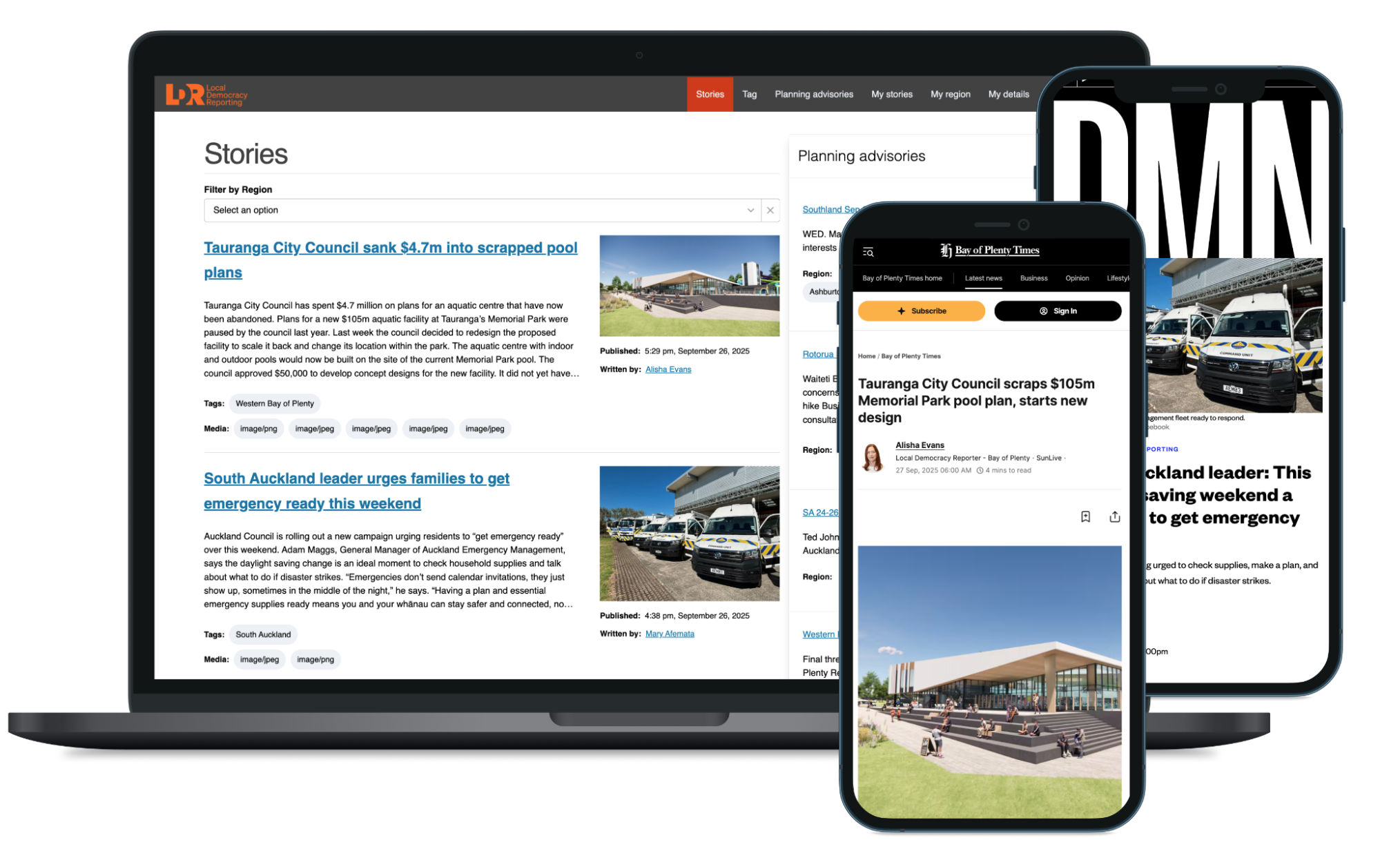 The Local Democracy Reporting (LDR) programme is a free public-interest news service managed and funded by RNZ, with support from New Zealand On Air. As of September 2025, the programme brings together 16 reporters across Aotearoa, producing stories that collectively attract more than 1.1 million page views each month.